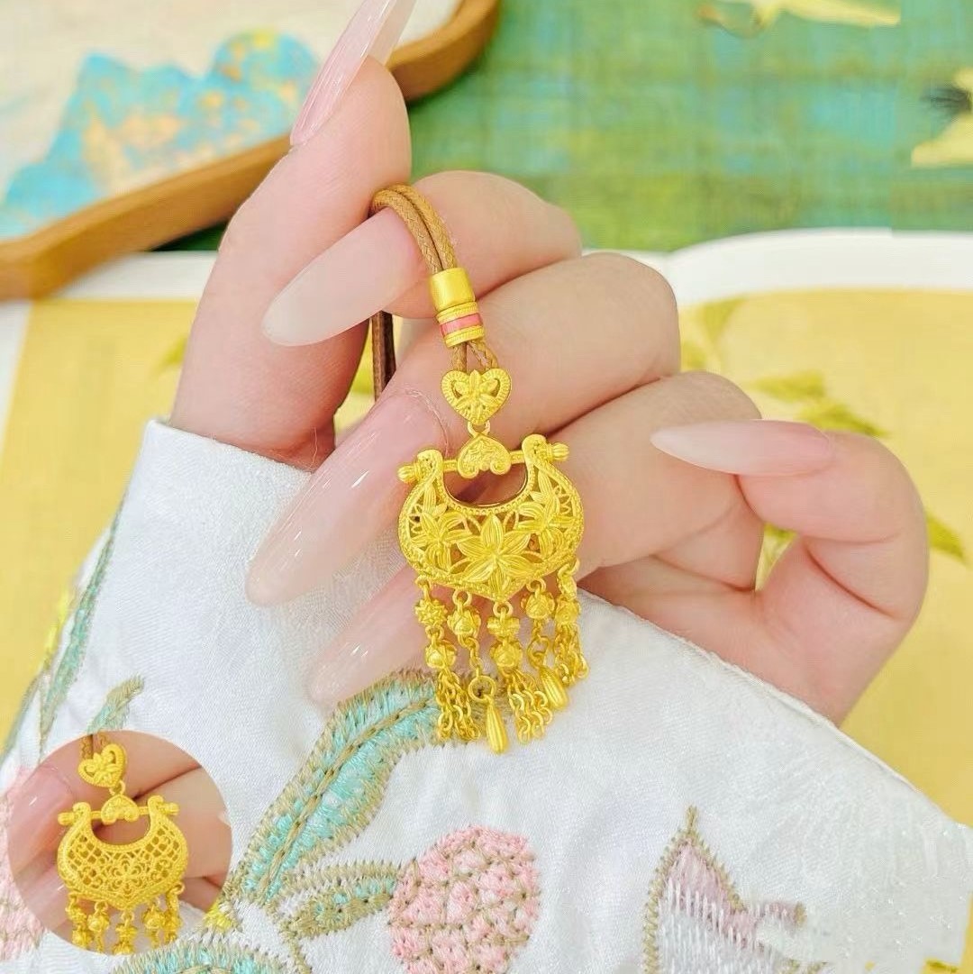 品名:純銀 精工雕花鍍金平安鎖流蘇立體繩墜